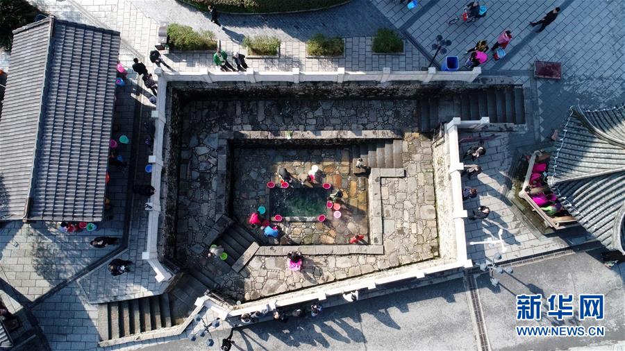 人們在江西宜春溫湯鎮(zhèn)的溫泉泉眼邊打水(2月28日無人機(jī)拍攝)。 新華社記者 彭昭之 攝