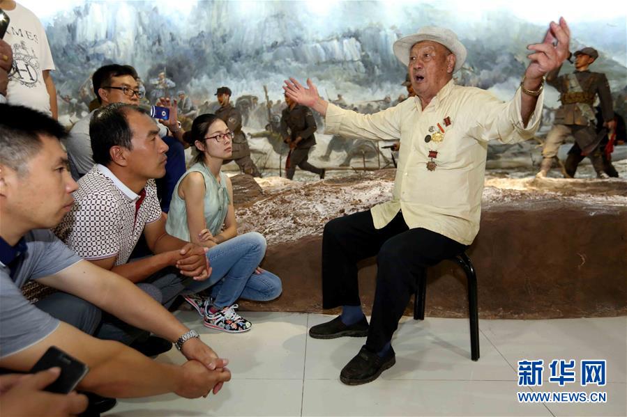 在乳山市馬石山十勇士紀念館,參加馬石山突圍戰(zhàn)的抗戰(zhàn)老兵趙金林給參觀者講述戰(zhàn)斗經(jīng)歷(2015年9月2日攝)。 新華社記者郭緒雷攝