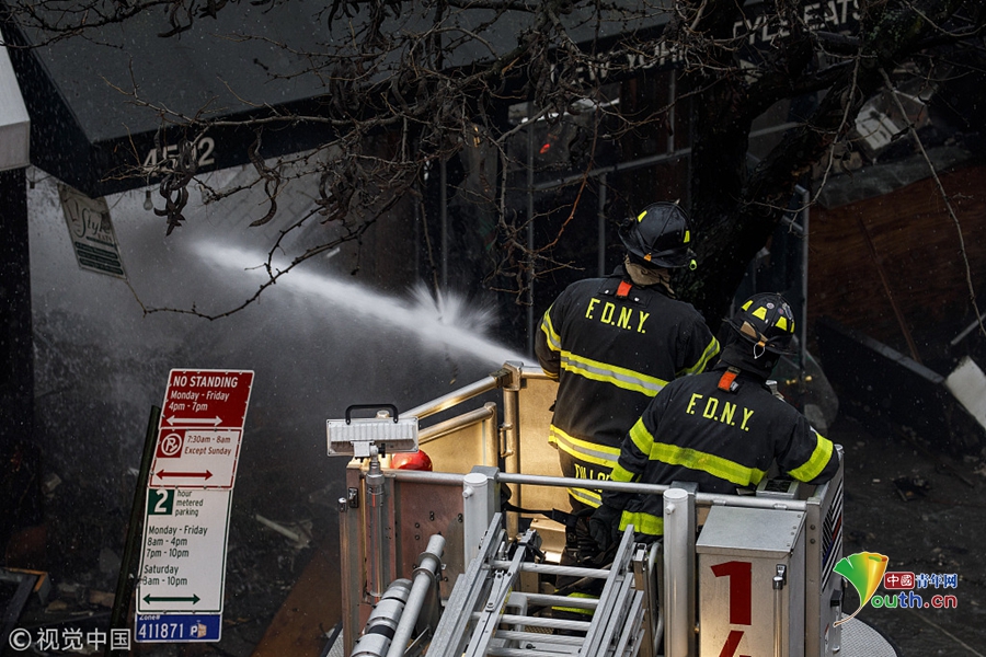 美國紐約,在紐約皇后區(qū)皇后大道,一場大火吞噬了六家商鋪,消防隊(duì)員正在努力撲滅火災(zāi)余燼。十幾人受傷,包括6名消防員。圖片作者:Drew Angerer
