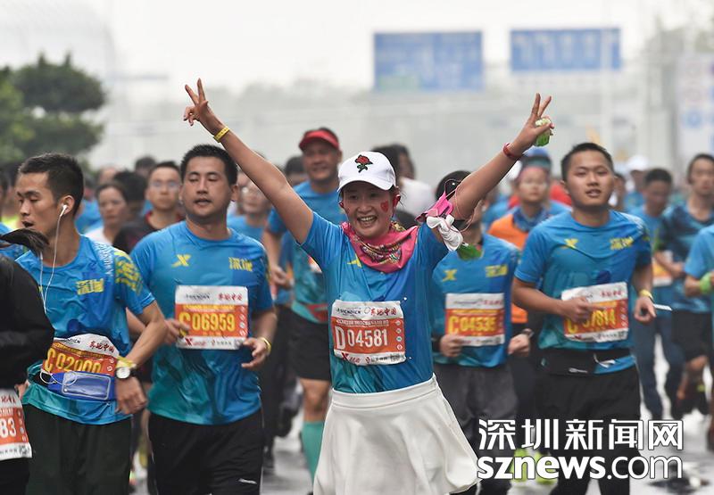 2018年12月16日,深圳國際馬拉松位于后海的折返點,即將抵達(dá)終點,一名選手?jǐn)[出勝利姿勢。