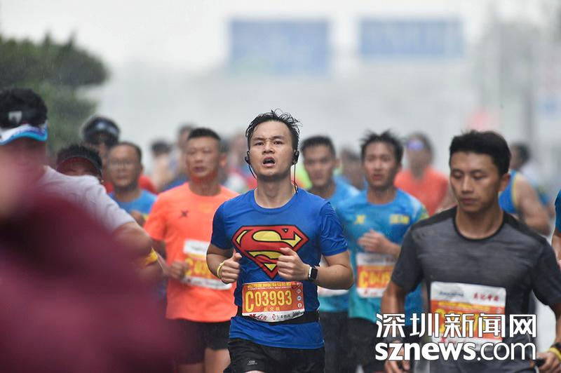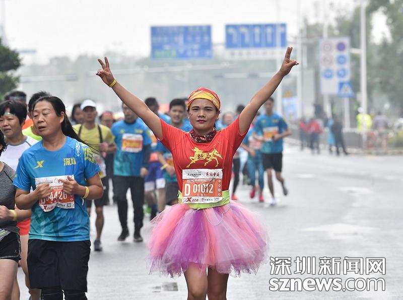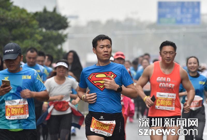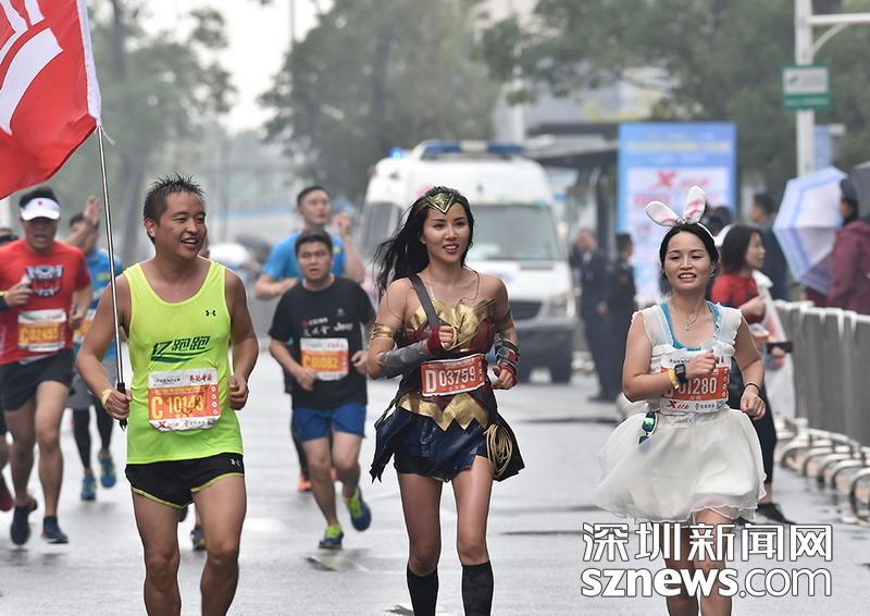 2018年12月16日,深圳國際馬拉松位于后海的折返點,三名選手正在向終點沖刺,跟其他選手不同,其中兩位選手選擇了自己搭配服裝參賽。
