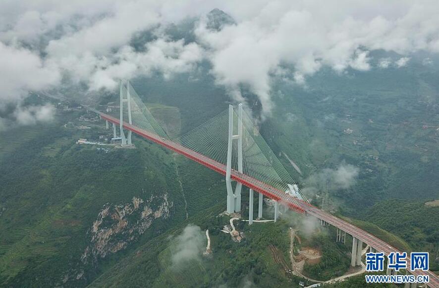 畢都高速公路北盤江大橋是杭瑞高速公路畢都段的控制性工程,位于貴州省和云南省交界處,由貴州省和云南省共建。該橋橋面至江面高差達(dá)565米,成為目前世界第一高橋。主橋?yàn)殇撹炝盒崩瓨?,主?20米,目前位居同類型橋梁2016年12月29日正式通車。