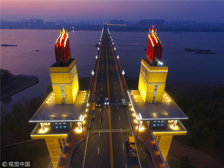 2016年10月28日晚,服役48年的南京長江大橋正式封閉,進(jìn)入合同工期長達(dá)27個月的改造提升期。身為我國橋梁建設(shè)領(lǐng)域的扛鼎之作,南京長江大橋的此次封閉改造牽涉到公路繁忙、鐵路風(fēng)險、技術(shù)攻關(guān)、文物保護(hù)等諸多難點(diǎn),不僅影響面廣,而且社會關(guān)注度極高。如今,隨著整個工程進(jìn)入收尾階段,即將于2018年12月底正式通車。圖為2018年12月13日,夜幕降臨,南京長江大橋歸位后的玉蘭花燈重新點(diǎn)亮。大橋玉蘭花燈柱共有299根,每根燈柱上有5盞玉蘭花燈,1大4小,一共1495盞。