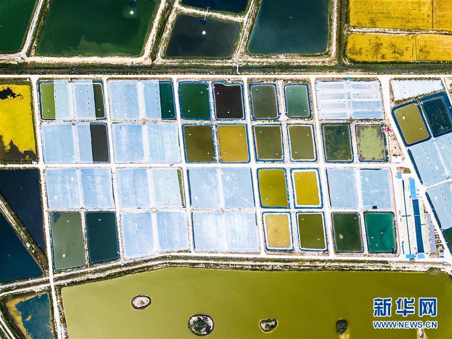 2018年9月11日航拍的寧夏賀蘭縣藍(lán)灣生態(tài)園南美對(duì)蝦養(yǎng)殖基地。 大地之色,俯仰之間;壯美山河,是我的祖國(guó)。2018年,新華社記者操縱無(wú)人機(jī)“飛閱”華夏大地,在最美的時(shí)節(jié),定格下她的色彩斑斕。 新華社記者 王建華 攝