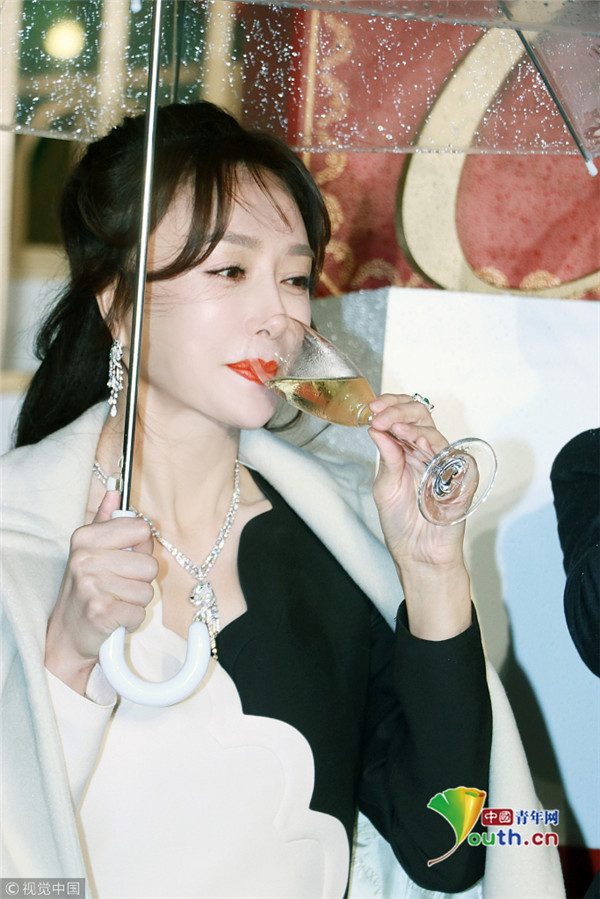 秦嵐撐傘雪膚紅唇美如畫 優(yōu)雅品香檳氣質(zhì)高貴迷人