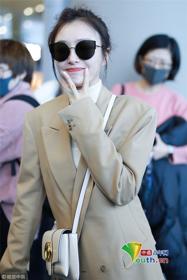 11月29日,上海,秦嵐現(xiàn)身機(jī)場。她戴白色鴨舌帽,穿白色星星圖案外套配微喇牛仔褲,架黑超涂紅唇笑靨如花。