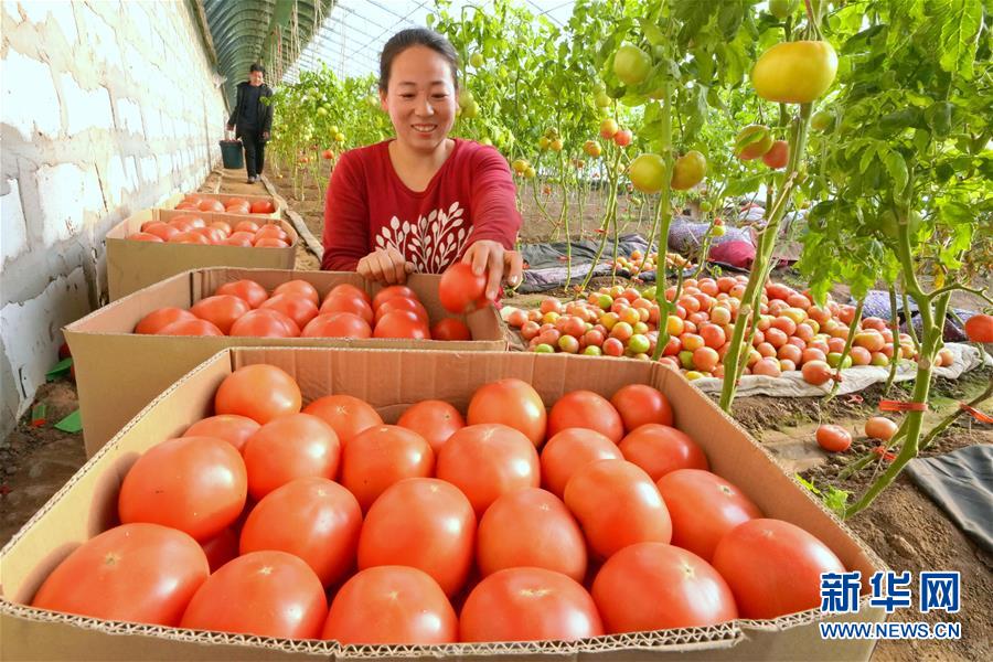 12月20日,唐山市豐潤(rùn)區(qū)百草坡農(nóng)產(chǎn)品農(nóng)民專(zhuān)業(yè)合作社社員在大棚內(nèi)收獲西紅柿。 新華社記者 牟宇攝