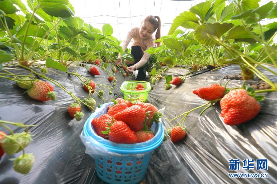 12月20日,游客在唐山市豐潤(rùn)區(qū)眾浩草莓種植專(zhuān)業(yè)合作社大棚內(nèi)采摘草莓。 新華社記者 牟宇攝