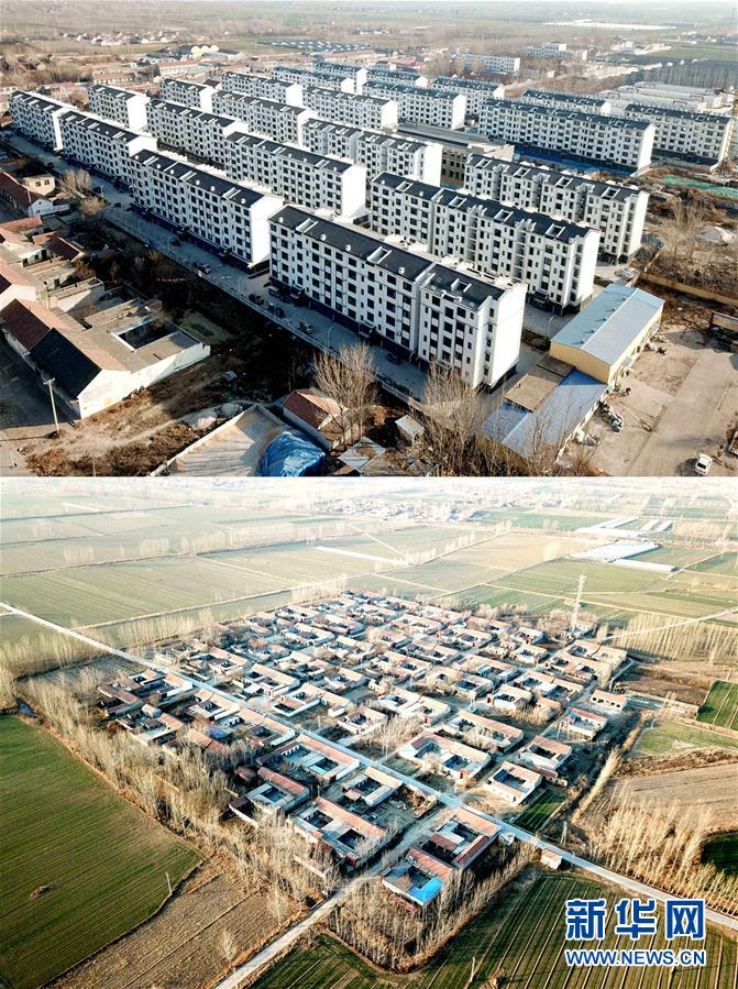 上圖為12月20日拍攝的青城鎮(zhèn)青平社區(qū);下圖為12月20日拍攝的搬遷完畢的青城鎮(zhèn)菜園村(無(wú)人機(jī)航拍,拼版照片)。