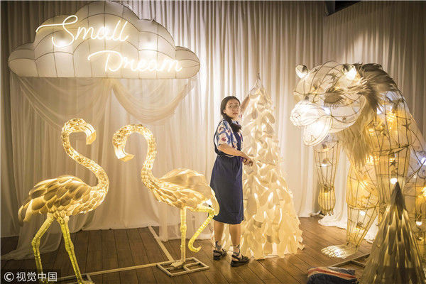 2018年5月6日,廣州,在天河區(qū)一家大商場(chǎng)辦個(gè)展時(shí),用紙片做成的北極熊、大松樹(shù)、火烈鳥(niǎo)、紙房子在光線(xiàn)的配合下美輪美奐,吸引了很多顧客駐足。“幾乎每個(gè)人一看到,都會(huì)走進(jìn)那個(gè)夢(mèng)幻的場(chǎng)景里,和這些紙雕一起合影?!眻D片攝于2018年5月6日。南塘/視覺(jué)中國(guó)