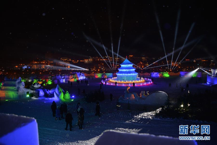 12月21日,游客在冰雪節(jié)開幕式上走過(guò)雪雕城堡。新華社記者鄒予攝