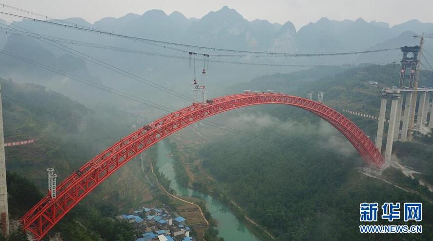 9月12日使用無人機拍攝的大小井特大橋。目前,橫跨在貴州省羅甸縣大井河上的大小井特大橋建設進入沖刺階段。大小井特大橋全長1.5公里,主跨450米,是世界最大跨徑上承式鋼管混凝土拱橋。據(jù)了解,該橋是平塘至羅甸高速公路關鍵性工程,對打通貴州“斷頭路”,助推滇黔桂石漠化片區(qū)脫貧攻堅具有重要意義。新華社記者劉續(xù)攝