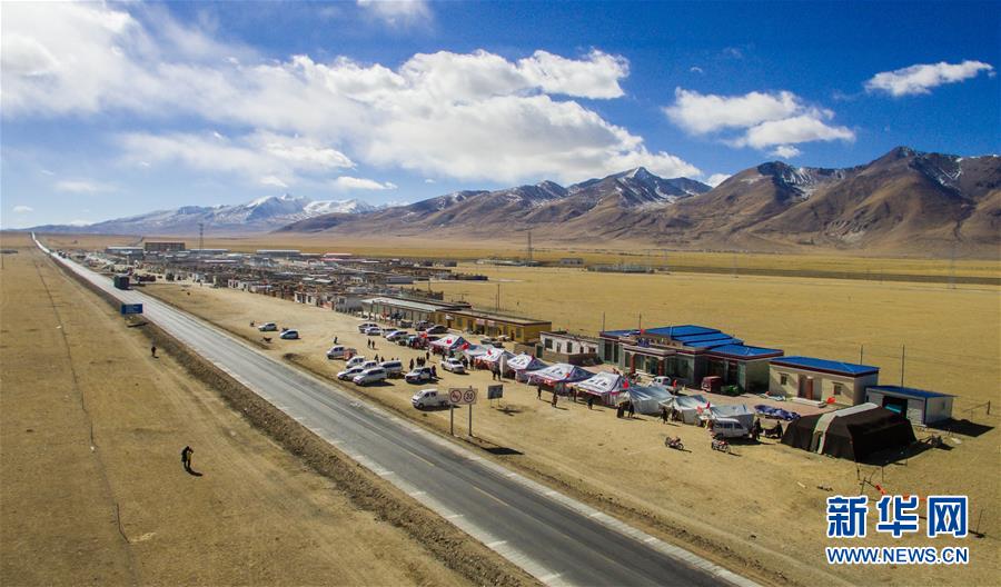 這是在青藏公路旁搭建的那曲縣香茂鄉(xiāng)畜產(chǎn)品展銷會(huì)(2017年11月25日無人機(jī)拍攝)。 新華社記者 劉東君 攝