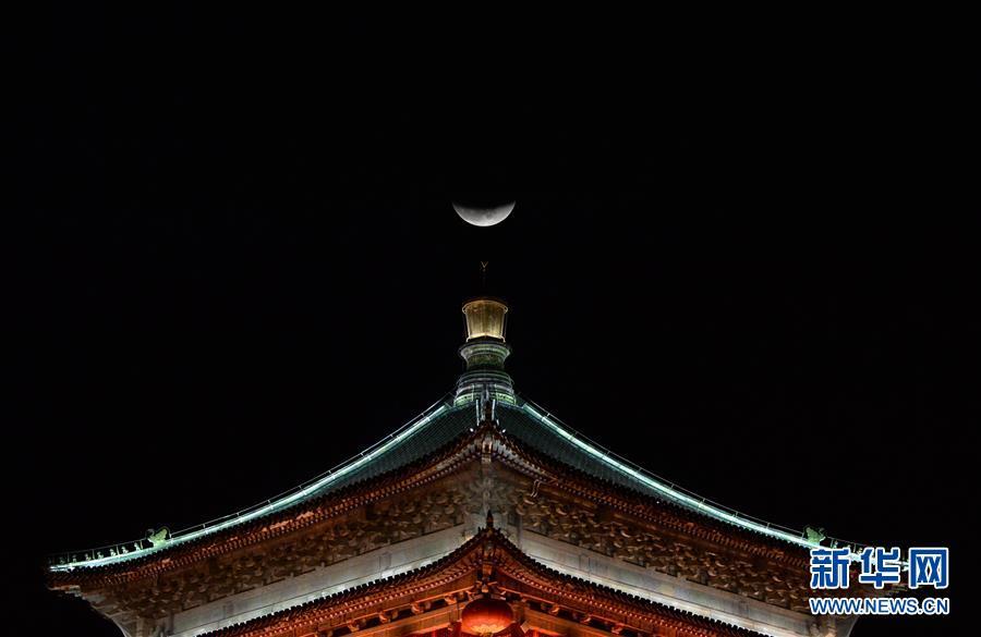 這是1月31日在陜西省西安市鐘樓拍攝的月亮。 在即將過去的2018年,各地?cái)z影師用鏡頭記錄下四季中國(guó)。大江南北,一幅幅色彩斑斕的美麗畫卷徐徐展開。 新華社記者 李一博 攝
