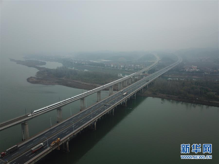 ↑12月25日,D9551次首發(fā)列車駛過富春江特大橋(無人機拍攝)。新華社記者 邢廣利 攝