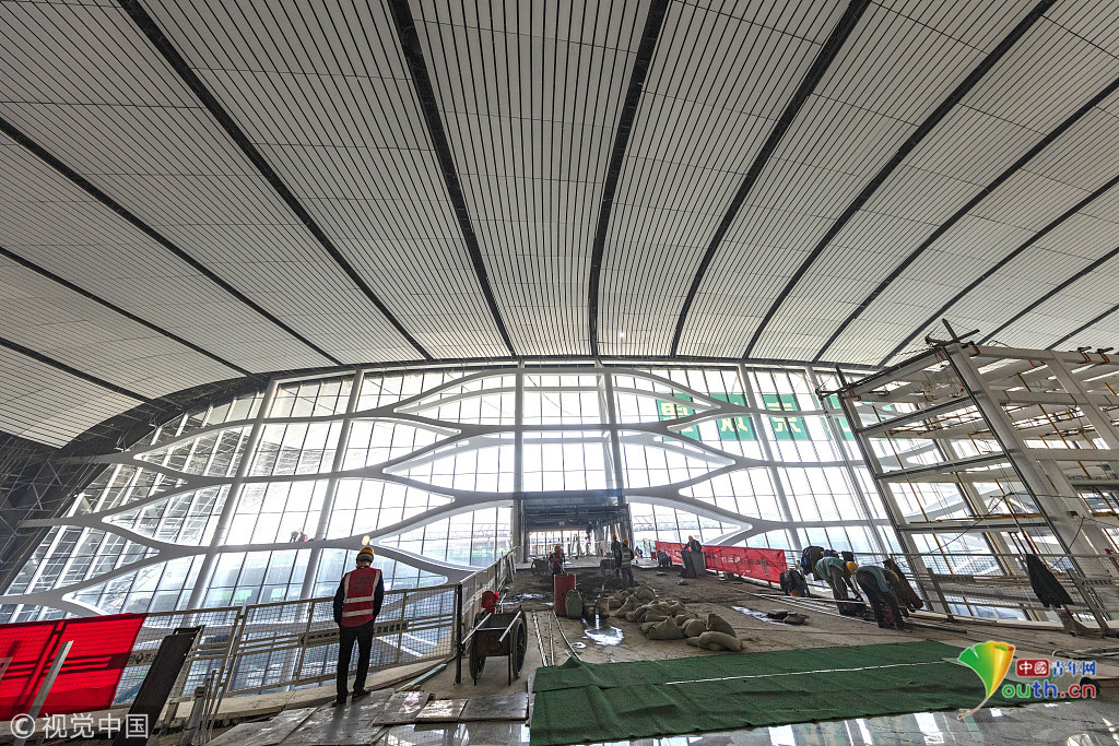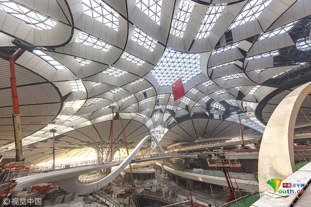 中國青年網(wǎng)北京12月20日電 2018年12月19日,北京大興國際機(jī)場航站樓的屋面已基本完工,一只金色“鳳凰”完整地出現(xiàn)在北京城南。航站樓的室內(nèi)裝修在有條不紊的推進(jìn)中。