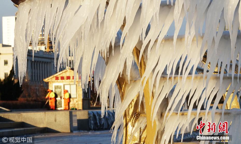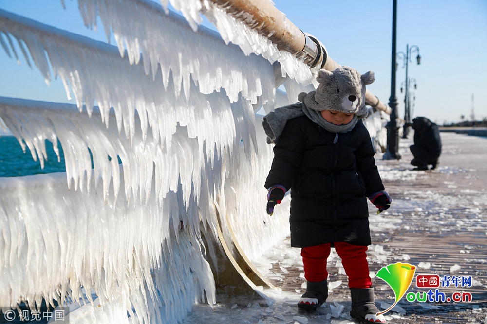 渤海海水在北風的作用下涌向岸邊,在大連東港海岸護欄上凝結(jié)成冰凌,形成約有兩公里的冰凌奇觀。圖為大連市東港海岸護欄結(jié)滿晶瑩剔透的冰棱。圖片來源:視覺中國