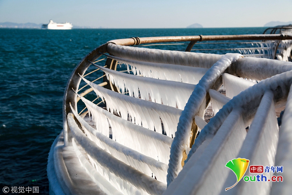 2018年12月29日,大連,晶瑩剔透的冰凌錯落有致的懸掛在東港海岸的木棧道護欄上,美輪美奐,形成了一道“風雕冰琢”的風景。