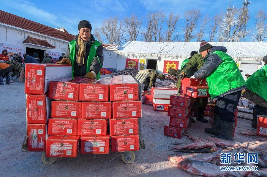 12月27日,在吉林松原查干湖漁場(chǎng),工人們將魚裝箱。 隨著吉林松原查干湖冬捕知名度不斷提高,全國(guó)各地消費(fèi)者對(duì)查干湖魚的需求量逐年增大。2014年開始,多個(gè)電商平臺(tái)和快遞企業(yè)紛紛抓住商機(jī)進(jìn)駐查干湖。經(jīng)過(guò)多年發(fā)展,借助互聯(lián)網(wǎng)銷售優(yōu)勢(shì)和日趨完善的快遞網(wǎng)絡(luò),全國(guó)多地的百姓可以在魚出水后的48小時(shí)內(nèi)品嘗到查干湖魚的鮮美滋味。 新華社記者張楠攝