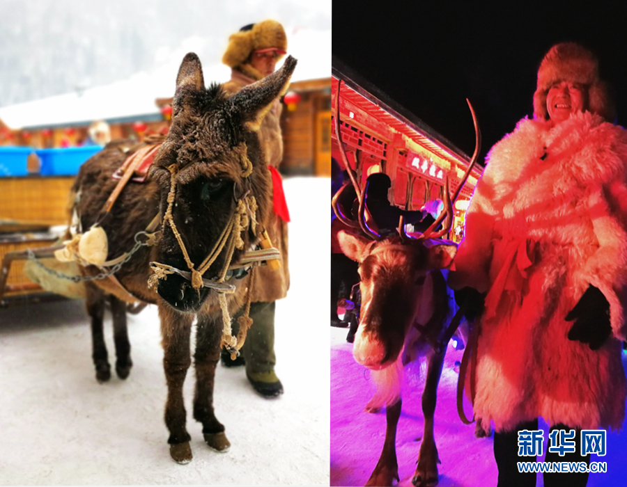 左圖為雪鄉(xiāng)的交通工具之一“驢拉雪橇”,右圖為牽著馴鹿的雪鄉(xiāng)村民。 新華網(wǎng)記者 張明宇 攝