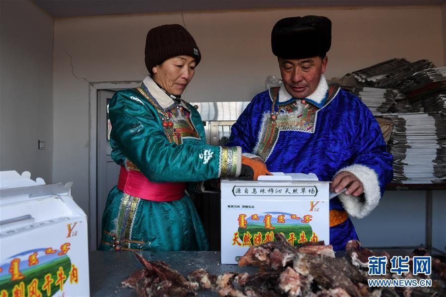 1月9日,牧民伊拉代(右)和妻子斯琴高娃在包裝風干好的牛肉。 新華社記者 劉磊 攝