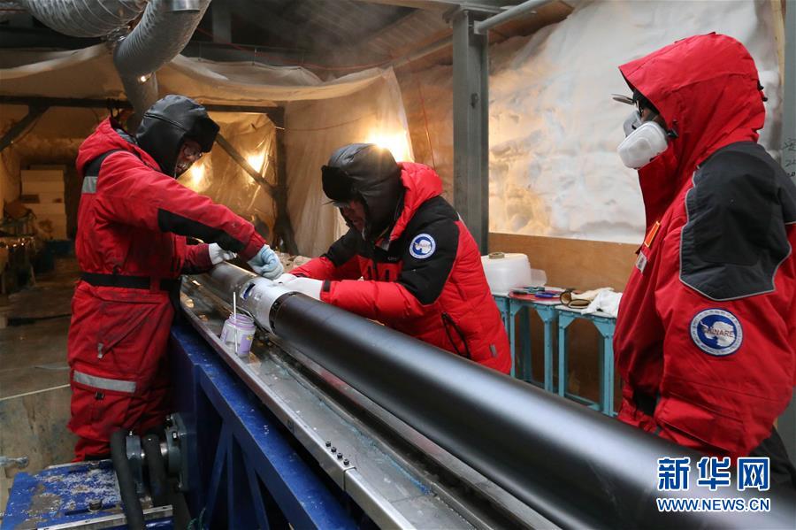 科考隊員清理深冰芯鉆具(1月12日攝)。 新華社記者 劉詩平 攝