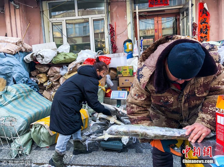 1月12日,黑龍江省佳木斯市撫遠(yuǎn)東極魚市,商戶在整理凍魚。棋簿紫 攝 圖片來源:視覺中國