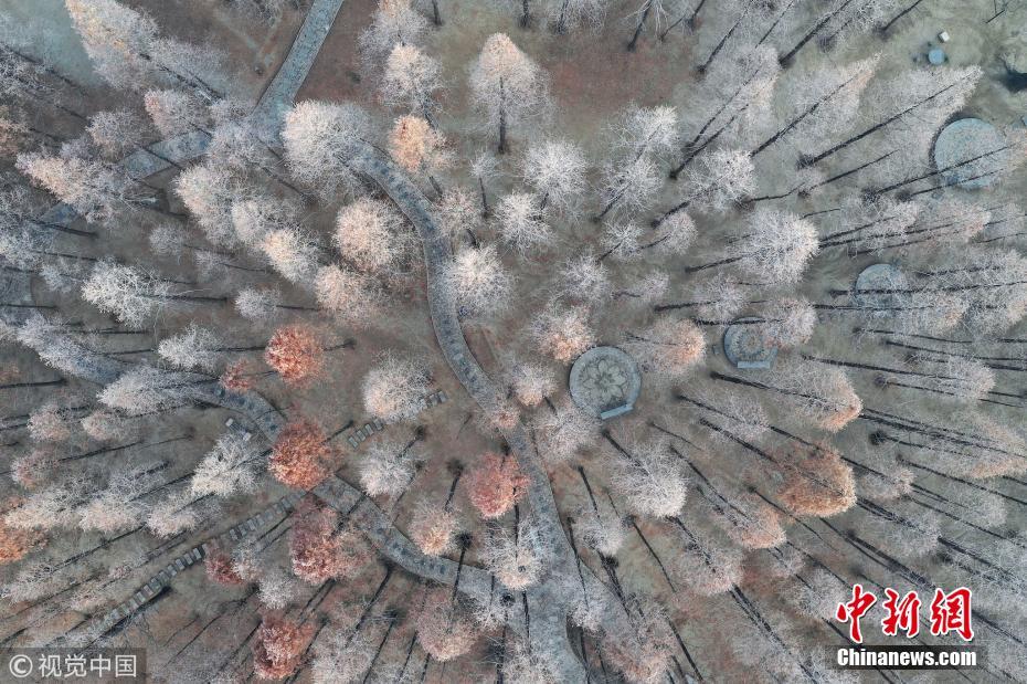 1月13日,霧散日升。河北省邢臺(tái)市大街小巷的樹(shù)枝上掛滿(mǎn)了潔白晶瑩的霜花,藍(lán)天下微風(fēng)吹拂銀絲閃爍,奇麗壯觀。給臘八節(jié)日增添了亮麗的風(fēng)景。霍紅軍 攝 圖片來(lái)源:視覺(jué)中國(guó)