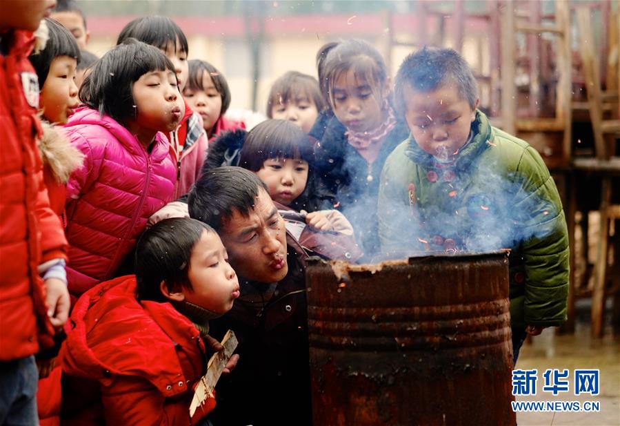 1月3日,章站亮(前右)和黃泥小學的學生們一起生火。由于生火用的材料均是廢棄的桌椅或者枯葉,點火后得不停地靠嘴吹氣才能燒得旺盛。