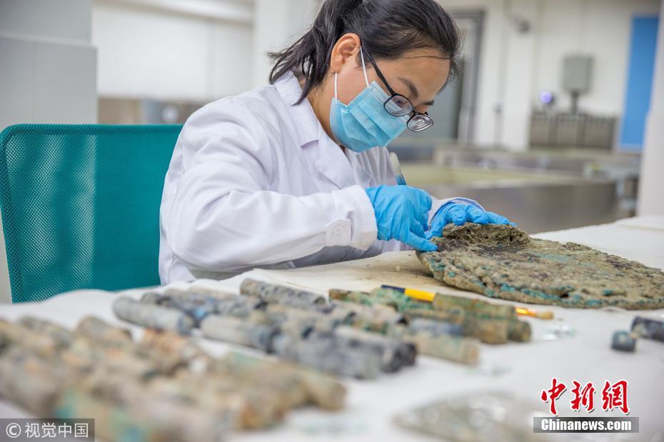 近日,廣東省博物館文物保護(hù)科技中心出水文物保護(hù)實(shí)驗(yàn)室里,宋薇正在清理一塊南澳一號(hào)出水的銅料,由于長期浸泡在水里,文物留有海洋生物,一塊牡蠣殼仍留在銅料上。譚慶駒 攝 圖片來源:視覺中國