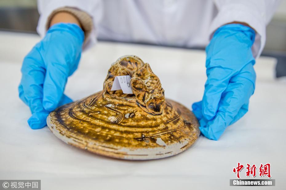 近日,廣東省博物館文物保護科技中心出水文物保護實驗室里,一件修復(fù)后的出水明代老虎醬釉罐的蓋子。譚慶駒 攝 圖片來源:視覺中國
