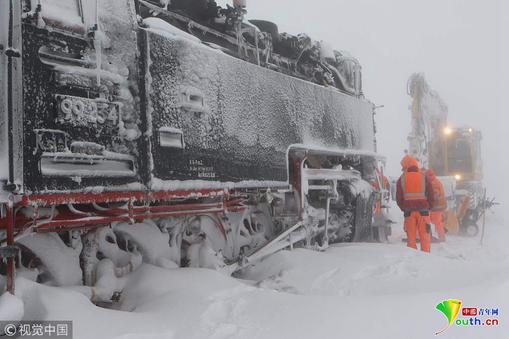 德國(guó)多地大雪紛飛 火車被困半路進(jìn)退不得