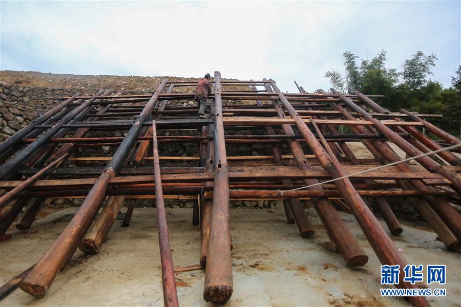 1月15日,在廣西融水苗族自治縣融水鎮(zhèn)夢(mèng)嗚苗寨,工人在吊腳樓的主要結(jié)構(gòu)上施工,準(zhǔn)備起樓。新華社記者 陳君清 攝
