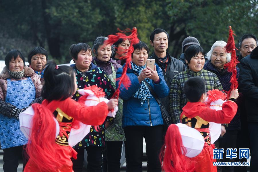 1月16日,新塘村村民觀看傳統(tǒng)非遺項目——下箬馬燈。下箬馬燈是發(fā)源于長興縣的民間舞蹈,距今已有1000多年歷史。 臨近春節(jié),浙江省長興縣開發(fā)區(qū)中心幼兒園的老師和孩子們來到長興縣太湖街道下屬的新塘村,為村民表演文藝節(jié)目,用喜慶的傳統(tǒng)舞蹈營造節(jié)日氣氛。另外孩子們還用紙盒、瓶子、彩色包裝紙等廢舊物品制作了環(huán)?;?,送給村民,倡導(dǎo)低碳環(huán)保的節(jié)日新風(fēng)。 新華社記者 徐昱 攝