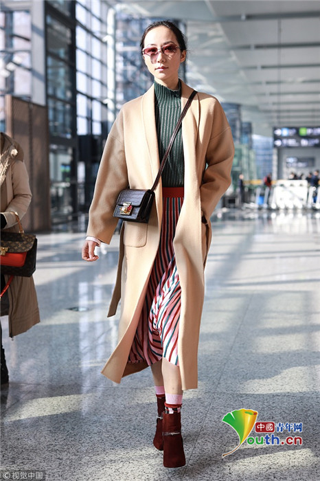 2019年1月17日,上海,韓雪現(xiàn)身機場,穿著條紋紗裙露出小腿,十分抗凍,她搭配經(jīng)典的駝色大衣,氣質(zhì)出眾在機場人群中相當(dāng)搶鏡。