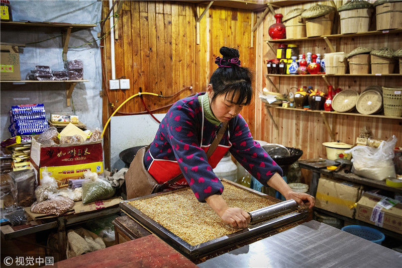 重慶江津區(qū)中山古鎮(zhèn)第十四屆 “千米長(zhǎng)宴”民俗文化節(jié)盛大啟幕。上午10時(shí),中山古鎮(zhèn)老街人聲鼎沸,窄窄的青石板路打掃得干干凈凈,家家戶戶門口掛起喜慶的紅燈籠,老商鋪門口擺滿了米酒、烤糍粑、煙熏豆腐……此次“千米長(zhǎng)宴”以“絲路情緣,‘埃’上中山”為主題。“千米長(zhǎng)宴”期間,游客們不僅可以一雙筷子吃遍全街,還可欣賞到祈福祭祀、民俗拜年、“打盆上菜”等表演,同時(shí)還增設(shè)了以唱、跳、講故事的上菜方式情景演繹愛情主題的文化餐飲,展示富硒愛情宴的文化內(nèi)涵。圖為街坊們?cè)陬^天就開始準(zhǔn)備各種菜肴與小吃。