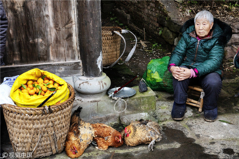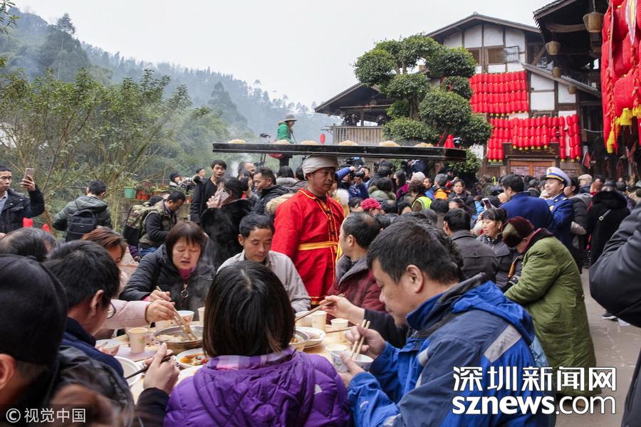 2019年1月26日,重慶中山古鎮(zhèn),880桌“千米長(zhǎng)宴”5萬人共品年味。當(dāng)?shù)刳s來的村民。
