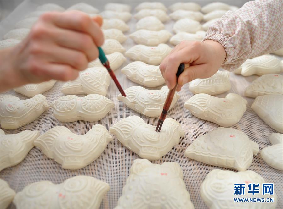 1月31日,河北省黃驊市一家面花作坊的工人給剛剛出籠的面花點上寓意吉祥喜慶的紅點。 河北黃驊市有著過年蒸面花的習俗。春節(jié)前夕,當?shù)孛婊ㄖ谱鞴S加班加點制作面花,供應春節(jié)市場。 新華社記者牟宇攝
