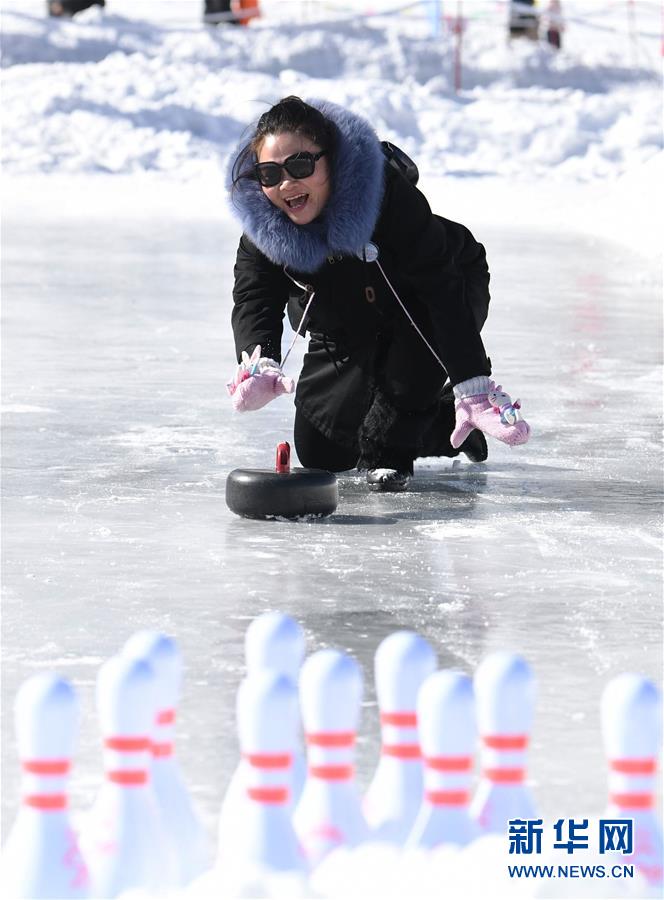 2月17日,一名游客在新疆天池景區(qū)玩冰上保齡球。 2018年入冬至2019年2月17日,新疆天池景區(qū)接待游客23萬人次,實現(xiàn)旅游經(jīng)濟收入2.25億元。新疆天池景區(qū)著力發(fā)展冬季旅游,為游客提供優(yōu)質(zhì)冰雪旅游體驗,逐漸將天池“冷資源”變成“熱經(jīng)濟”。 新華社記者沙達(dá)提攝