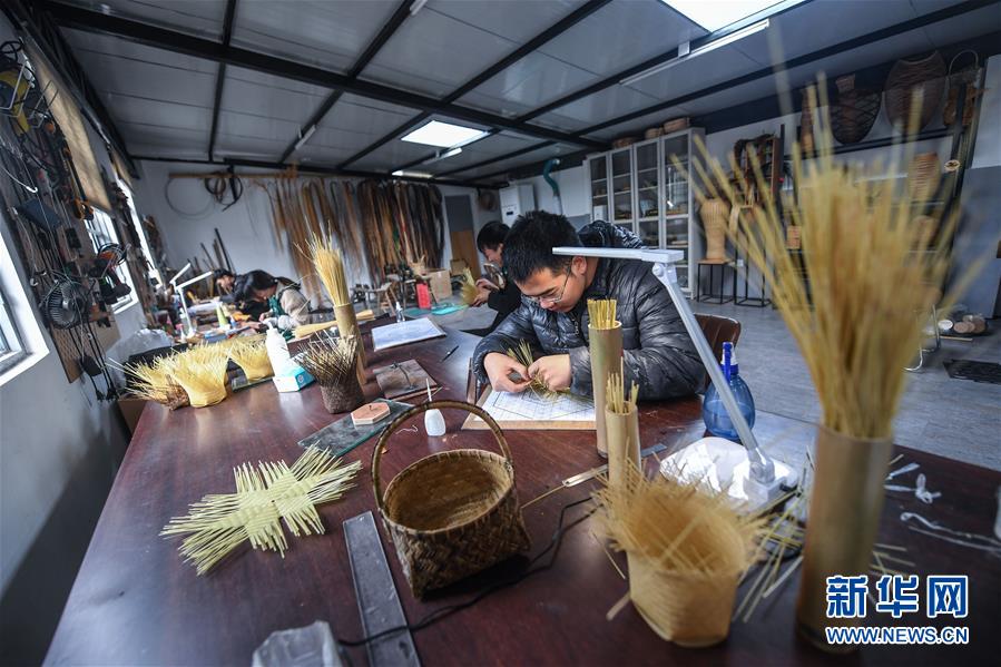 在烏鎮(zhèn)陳莊村竹蕓工房內(nèi),工作人員在制作竹編產(chǎn)品(11月20日攝)。  新華社記者 徐昱 攝
