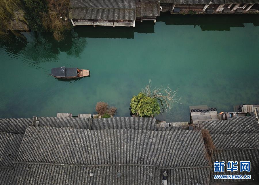 2月25日,游人在烏鎮(zhèn)景區(qū)內(nèi)乘船觀光(無人機(jī)拍攝)。 隨著氣溫升高,浙江省桐鄉(xiāng)市烏鎮(zhèn)景區(qū)春意萌動(dòng)。 新華社記者翁忻旸攝