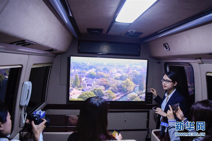 在浙江移動(dòng)烏鎮(zhèn)分水墩營業(yè)廳外,工作人員在一輛體驗(yàn)巴士內(nèi)介紹通過5G移動(dòng)傳輸技術(shù)實(shí)現(xiàn)的8K高清的視頻畫面實(shí)時(shí)展示(10月30日攝)。  新華社記者黃宗治攝
