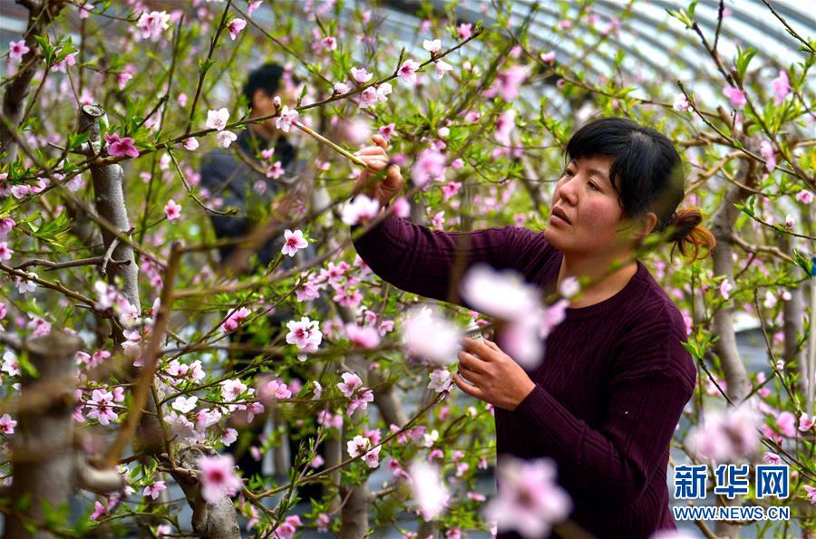 2月25日,果農(nóng)在邯鄲市邯山區(qū)碩果春農(nóng)業(yè)園大棚內(nèi)為桃花授粉。 隨著氣溫升高,河北省邯鄲市邯山區(qū)碩果春農(nóng)業(yè)園大棚內(nèi)的桃花競(jìng)相綻放。 新華社記者 王曉 攝