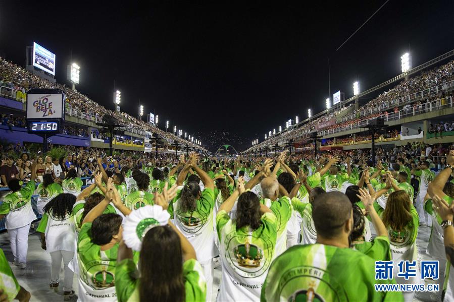 3月3日,在巴西里約熱內(nèi)盧,特級組桑巴舞校工作人員參加狂歡節(jié)游行。 3月3日晚,2019年里約熱內(nèi)盧狂歡節(jié)特級組桑巴舞校在桑巴大道開始花車巡游表演。 新華社記者李明攝