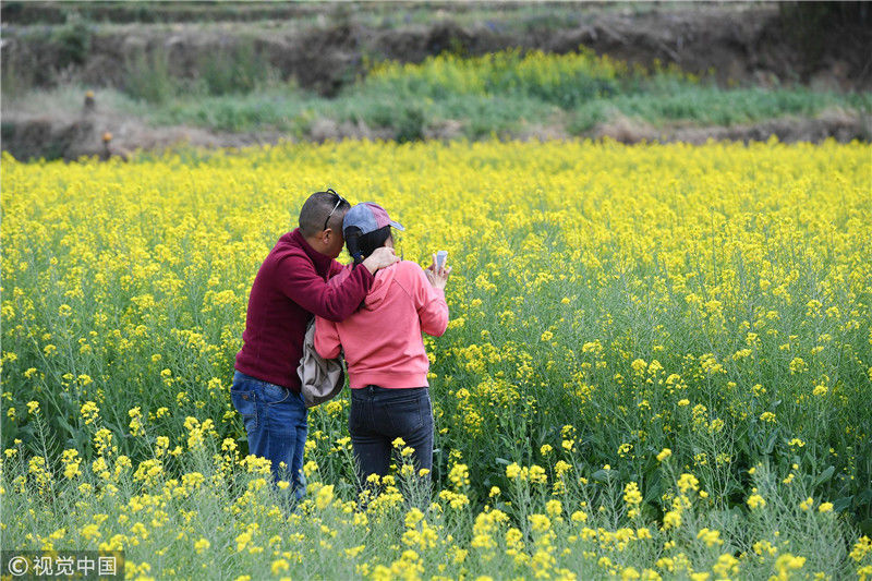 2019年3月1日,游客在花海中拍照。近日,位于云南省安寧市的大片油菜花進(jìn)入盛花期,吸引民眾到此賞花。