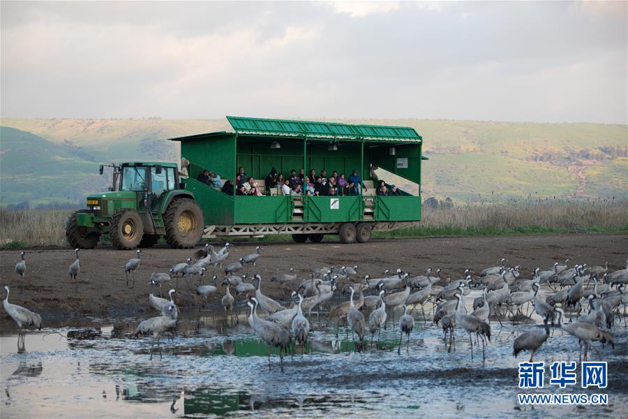 3月7日,在以色列阿格蒙胡拉鳥類和自然公園,游客乘坐拖拉機牽引的觀光車觀鳥。位于以色列北端的胡拉谷地冬季氣候相對溫暖濕潤,食物來源充足,是候鳥在歐洲和非洲之間遷徙的重要中轉站。20世紀90年代,當?shù)剞r(nóng)民、以色列農(nóng)業(yè)部和自然保護組織共同設立阿格蒙胡拉鳥類和自然公園,在指定的地點給候鳥喂食,既能保護周邊農(nóng)田的莊稼不被候鳥啄食,又能為遷徙的候鳥補充之后旅程所需的能量,成為候鳥“加油站”。新華社記者郭昱攝
