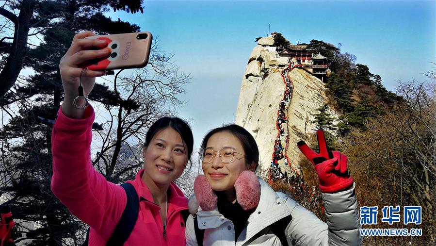 3月9日,游人在華山游覽拍照。 隨著氣溫回升,陜西著名風景區(qū)華山進入旅游旺季。 新華社記者 陶明 攝