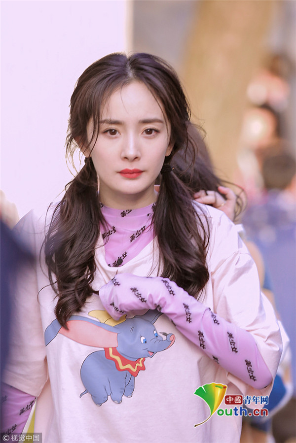 楊冪穿粉衣扎雙馬尾甜美可愛 身材纖細(xì)元?dú)鉂M滿