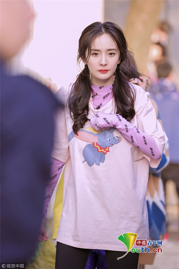 楊冪穿粉衣扎雙馬尾甜美可愛 身材纖細元氣滿滿