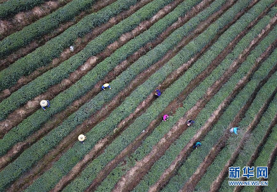 3月17日,采茶工在丹寨縣龍泉鎮(zhèn)馬寨村的茶園里采摘春茶(無人機拍攝)。新華社記者 楊文斌 攝